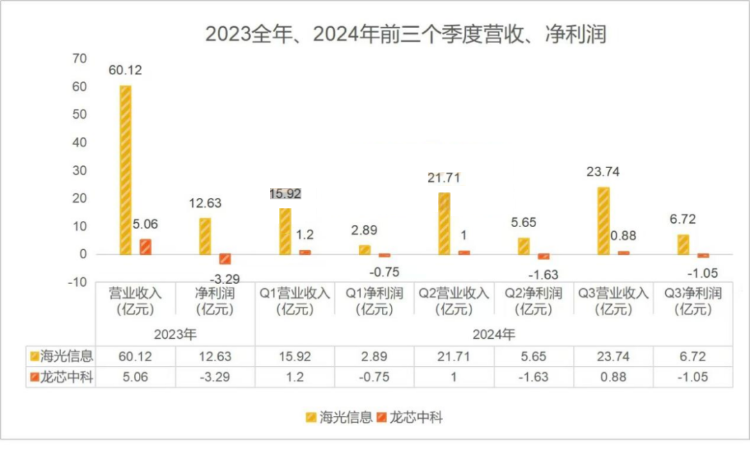 2024 年Q1海光信息实现营收15.92亿元,同比增长37.09%;实现归母净利润2.89 亿元,同比增长20.53%;Q2海光信息实现营收21.71亿元,同比增长49.67%;归母净利润5.65 亿元,同比增长28.95%;Q3海光信息实现营收23.74亿元,同比增长78.33%;归母净利润为6.72亿元,同比大增199.9%。反观龙芯,龙芯中科2023年实现营收5.06亿元,同比下降31.54%;归属于上市公司股东净利润亏损3.29亿元,同比下降736.57%。2024年Q1龙芯中科实现营收约1.2亿元,同比增加1.62%;归属于上市公司股东的净利润亏损约7481万元,上年同期亏损7217.92万元;Q2龙芯中科实现营收1 亿元,同比减少47.53%,实现归母净利润-1.63 亿元,同比亏损扩大416.74%;Q3龙芯中科实现营收8819.37万元,同比上升2.05%,归母净利润-1.05亿元,同比下降1.47%。