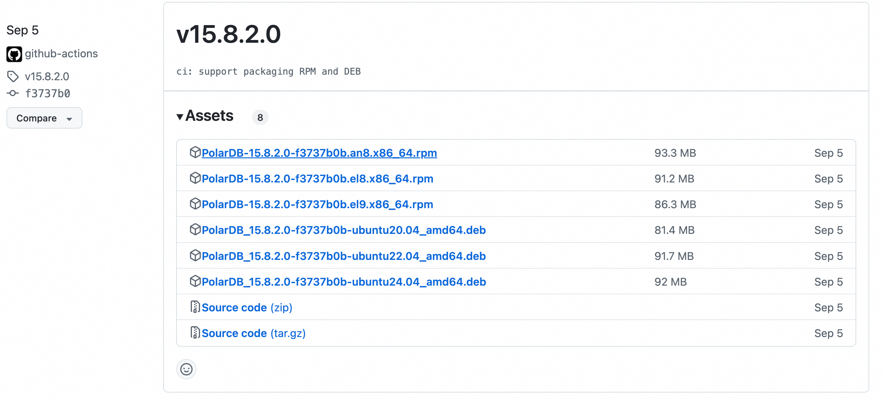从github上下载开源PolarDB-PG15的rpm包,并在每台机器上安装。这里使用的是Centos 8系统,因此下载el8的包即可(https://github.com/ApsaraDB/PolarDB-for-PostgreSQL/releases)