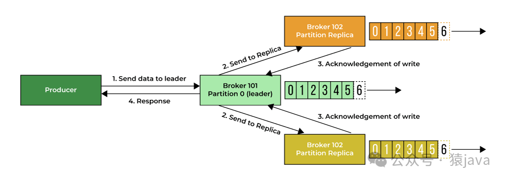 时,Kafka只有在消息被写入 ISR中的所有副本后才会返回确认,这确保了消息即使在 Leader故障的情况下也不会丢失,因为 ISR中的其他副本可以选举为新的 Leader。
