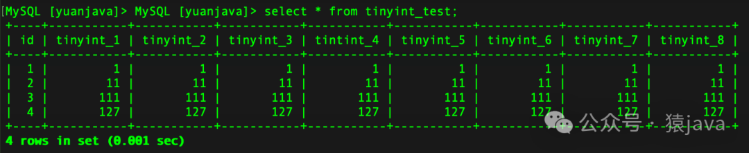了解了 tinyint以及 tinyint(M)中 M的具体含义,我们依然使用上面的例子,把 size定义成 tinyint(4)类型,然后插入 3条数据,如下 SQL语句: