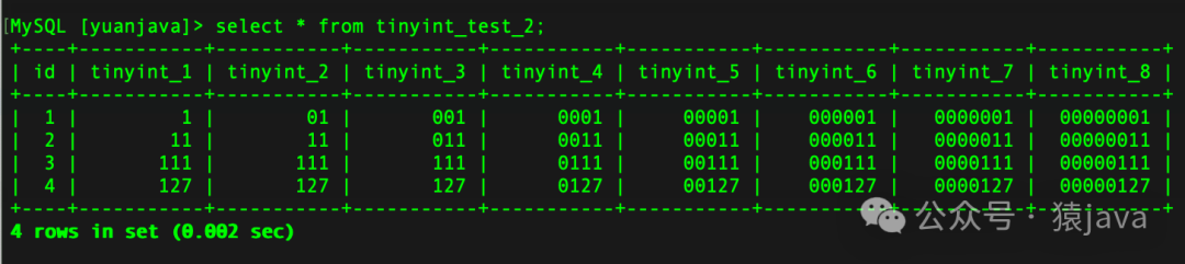 通过上述示例可以看出:tinyint(M)中的 M其实并不会影响最终存储的值,影响的是在 Zerofill模式下的数据展示的宽度。