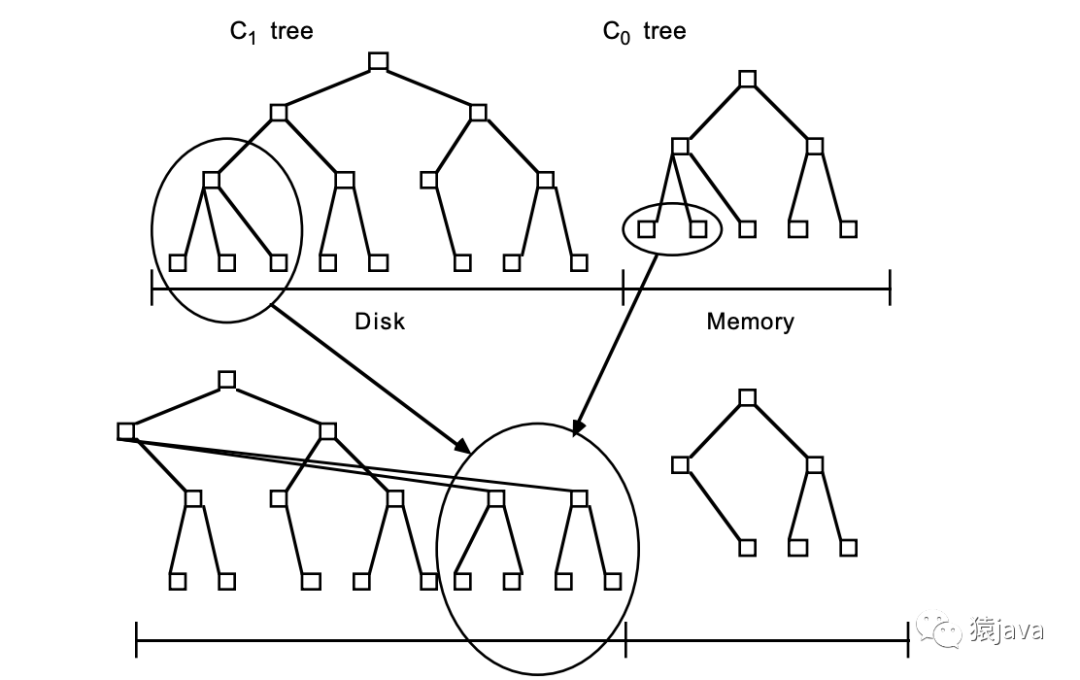 早期 LSM-Tree 的思路是将索引树结构拆成一大一小两棵树,小的索引树 C0 tree 存储在内存, 大的索引树 C1 tree 存储在磁盘,它们共同维护一个有序的 key空间;