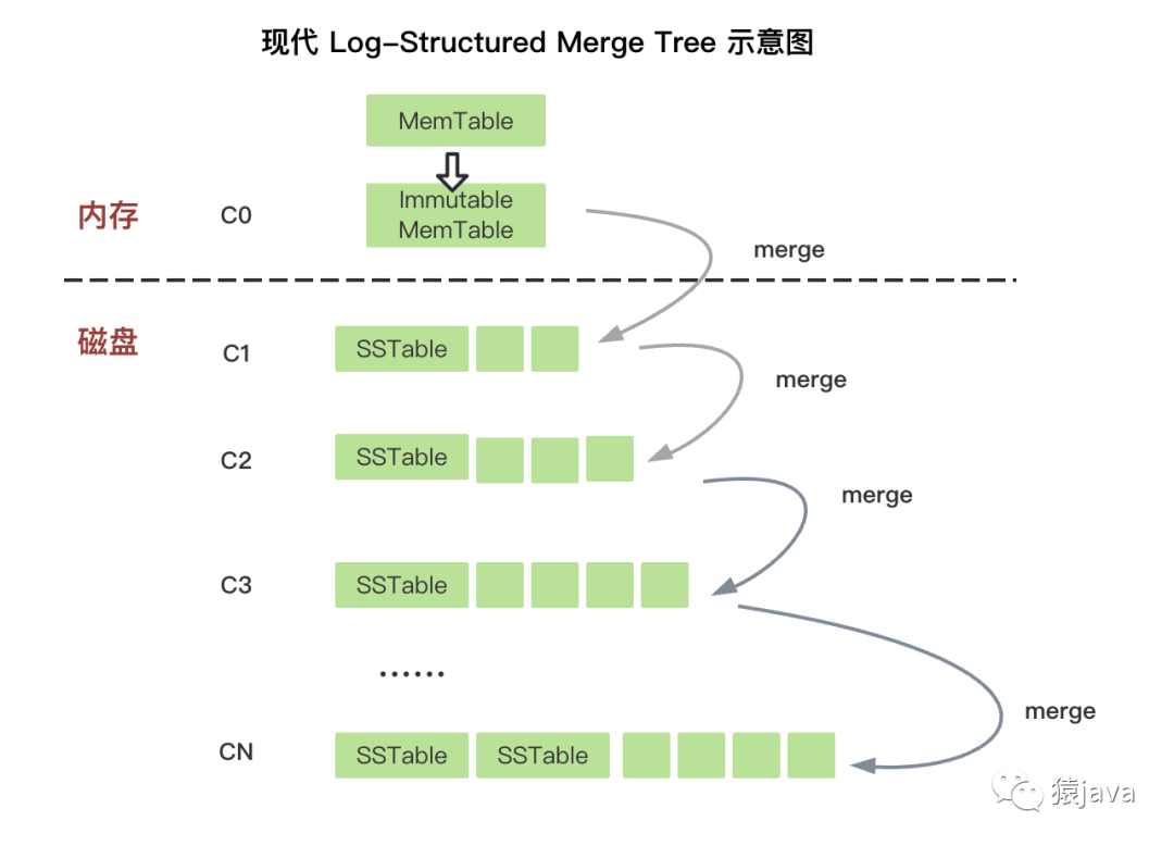 现代 LSM-tree 包含了三个部分:memtable、immutable memtable、SSTable,前两个位于内存,最后一个位于磁盘中;