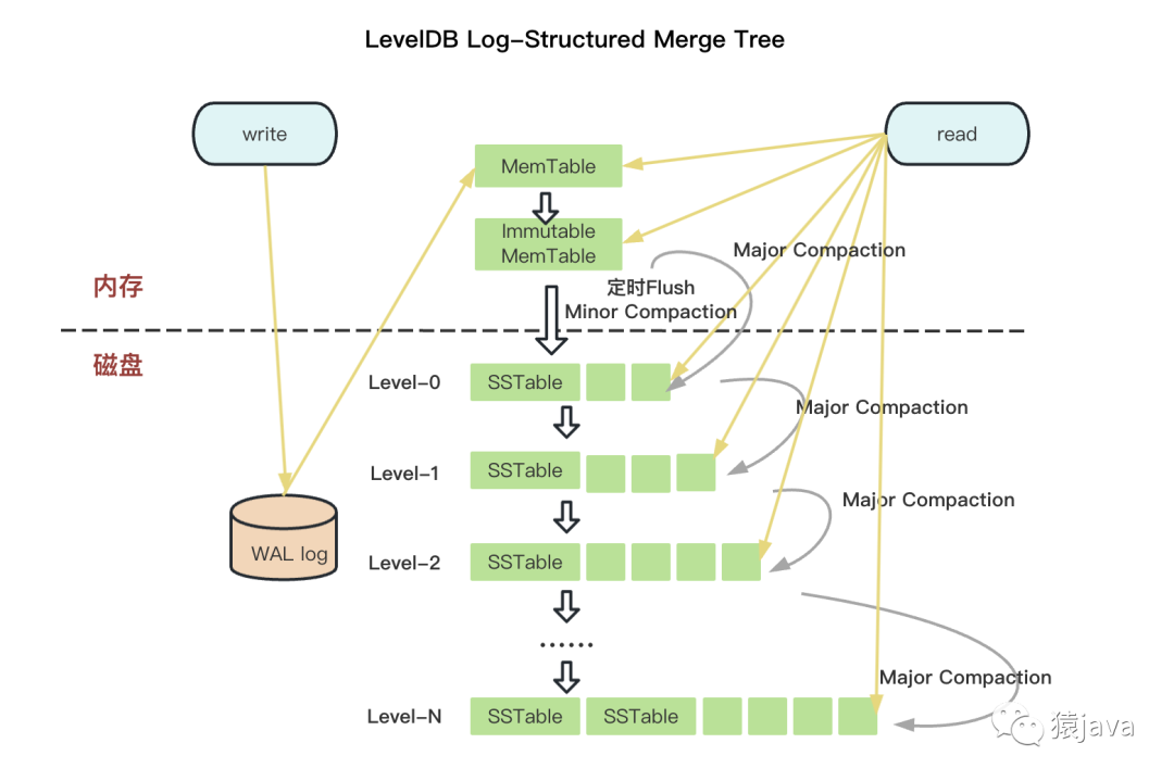 内存与磁盘的合并(Memtable to SSTable):当内存缓存达到一定大小或者其他触发条件满足时,将内存缓存中的 key-value写入到磁盘上的 SSTable 文件中,通常以一种有序的方式进行存储。