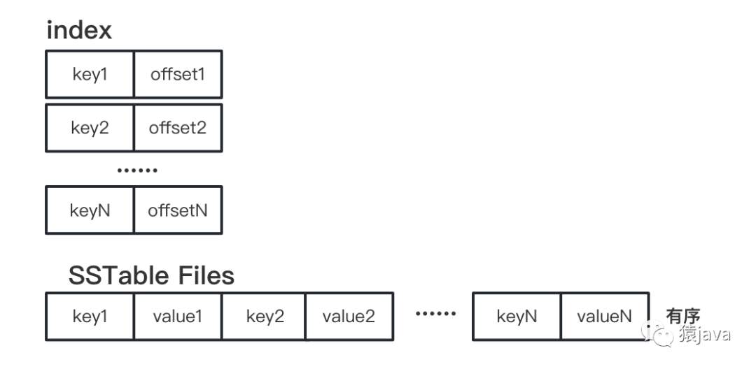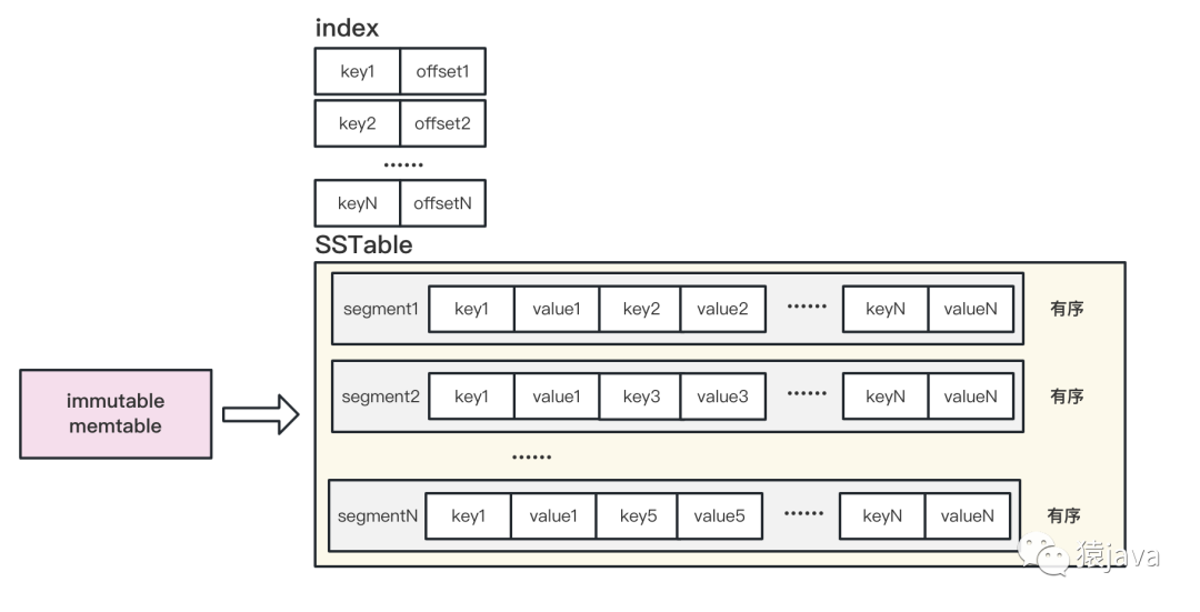SSTable 是 LSM-Tree 的核心,主要是用于数据在磁盘上的持久化存储,存储一些按照 key 有序排列的键值对组成的 segment。另外,为了加快查询速度,通常需要给 SSTable 创建索引,索引存储在 SSTable的尾部,用于帮助快速查找特定的 segment,结构示意图如下: