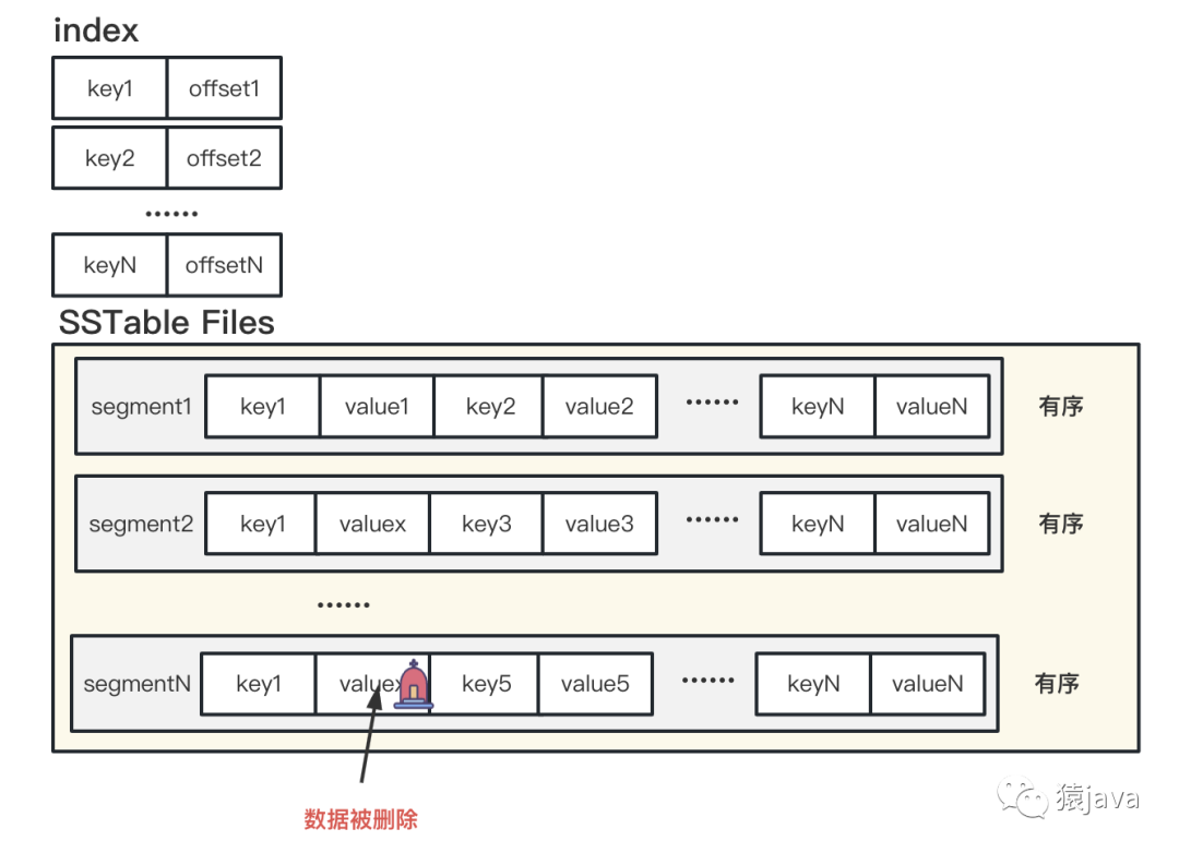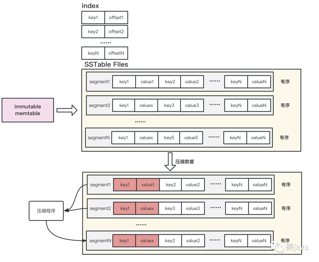 随着数据的增多,segment也会越来越多,显然在一个 SSTable 中存放太多的segment 是不合理的,同时存在不同的 segment 中可能存在相同的key,该如何处理呢?
