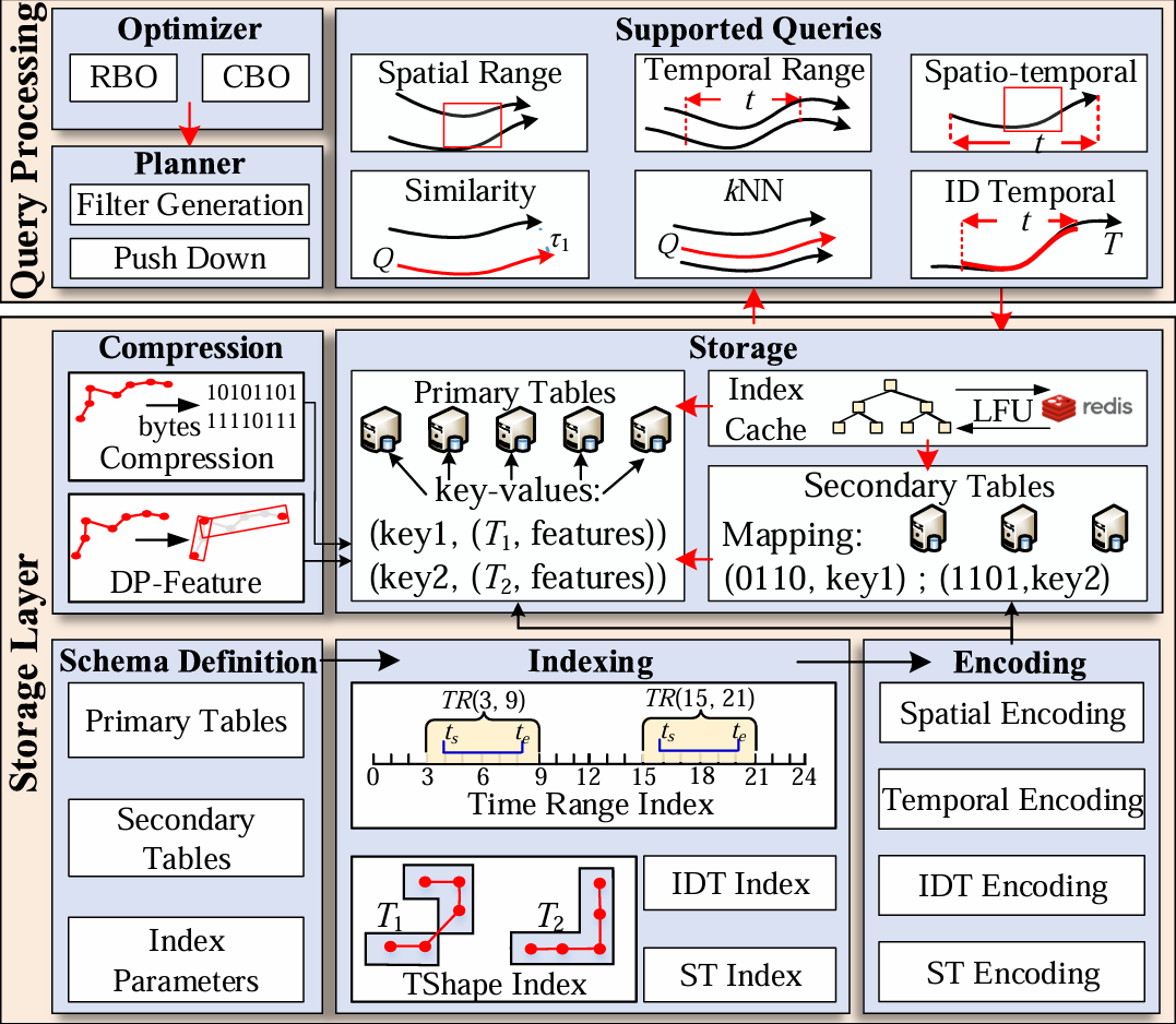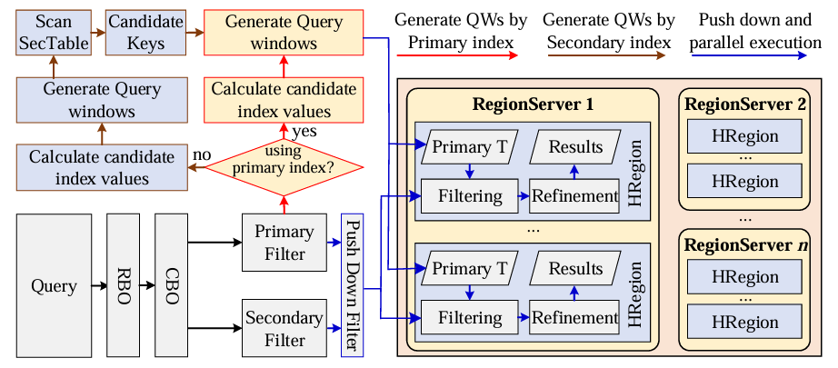 • 查询处理层(Query Processing):TMan提供高效的查询处理能力,能够支持各种基础查询,如空间范围查询、ID时间范围查询、时空范围查询和相似性查询。接收到查询后,系统会基于规则的优化器(RBO)和基于成本的优化器(CBO)生成最佳查询计划。随后,TMan将过滤器下推到相关表区域,并并行执行查询,以提高处理效率。
