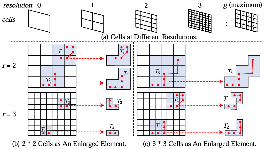 TShape索引的空间结构如下:首先,通过应用四叉树的规则,将单一单元格递归地划分为四个子单元格,每个子单元格的分辨率更高。图3(a)中展示了不同分辨率的单元格。接着,TShape索引采用相同分辨率的𝛼∗𝛽个单元格,构建出一个放大元素,并使用放大元素中单元格的组合作为索引空间来描绘轨迹的几何形状。