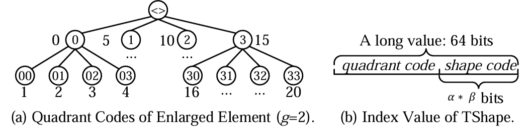 轨迹由一系列连续的时空点组成,这些点形成了不规则的空间形状,而不规则的空间形状不利于查询,鉴于此,文章提出了TShape索引技术,它分配最合适的一维索引值来表征轨迹的几何形状。