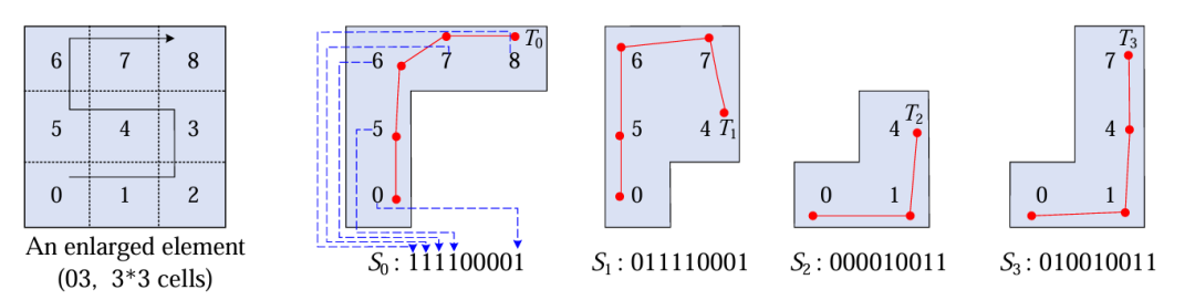 例如图5所示,放大元素‘03’包含9(3∗3)个单元格,并用数字0至8标记这 9个单元格的相对位置。该放大元素涵盖了轨迹𝑇0、𝑇1、𝑇2和𝑇3,这些轨迹的形状分 别由形状码𝑠0、𝑠1、𝑠2以及𝑠3表示。