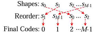 在实际应用场景中,放大元素内通常仅有少量的形状码被用于表征轨迹形状,可以显著精简编码空间大小。此外,相似的轨迹倾向于拥有相似的索引空间。因此,新的形状码编码策略应当维护这一相似性特征。假设在一个放大元素中仅有𝑀个实际使用的形状,记作集合𝒮={𝑠0, 𝑠1, ..., 𝑠𝑀−1}。形状码重新编码的优化目标是按照最佳顺序将这M个形状从0到𝑀−1进行重新编号。图6展示了一个例子,TMan的目的是让在空间上相似的形状,其形状代码应越接近。