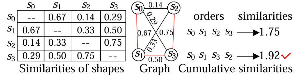 这个问题可以看作是TSP问题(旅行商问题,一种NP难问题)的一个变种,旨在寻找不返回起点的最长路径。针对给定的𝑀个待编码的形状,可通过一个完全图来 表征各形状间的相似度关系,每个形状对应图中的一个节点,形状之间的相似性是相应节点之间的边。编码目标在于确定一条最长的路径,确保每个形状有且仅被访问一次。TMan利用贪心算法(GreedyAlgorithm)和遗传算法(GeneticAlgorithm)来解决形状编码问题。具体来说,贪心算法作为一种启发式方法,在每次迭代中优先选择距离最远的未访问形状以构建路径。贪婪心算法的主要优势在于其简洁性与高效性。图7中呈现了四种形状,它们之间的相似度如图7最右边所示。贪心算法确定的最优编码顺序为 ⟨S0, S1, S3, S2⟩ ,对应的累积相似度为1.92,而原始顺序(⟨S0, S1, S2, S3⟩)的累积相似度仅为1.75。因此,新编码方案更有利于将相似度较高的形状编码得更为接近。