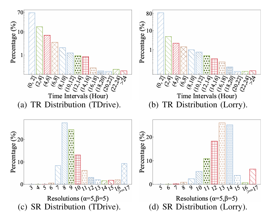 数据集:文章使用了三个数据集评估来TMan的效率:(1)TDrive。包含北京一周内的318,744条出租车的轨迹;(2)Lorry。该数据集由从2014-03-01到2014-03-31 期间生成的货车数据,进行预处理后,它包含了来着广州的2,643,450条货车轨迹;(3) Synthetic。为评估可扩展性,文章将原始货车轨迹数据的位置进行了随机偏移,生成 了10倍的货车数据。TDrive数据集大小为752MB,货车数据的总大小超过了100GB。 图10(a)和(b)显示了TDrive 和 Lorry 数据集中轨迹的时间范围分布情况。