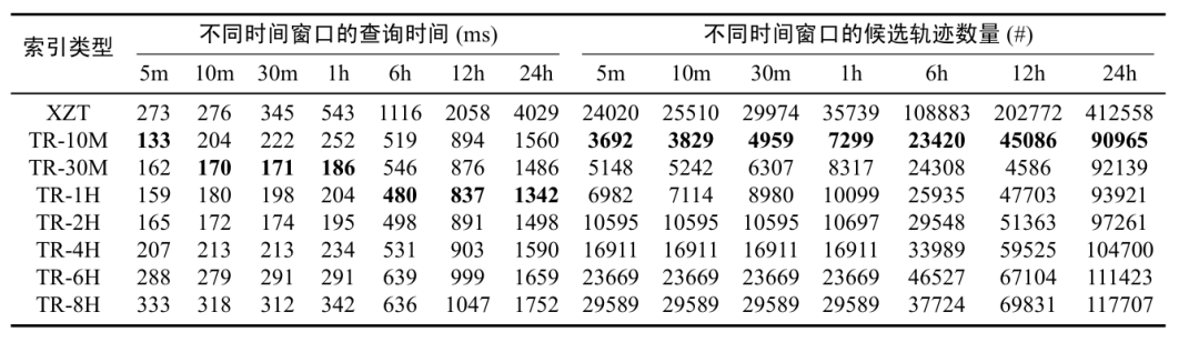 TR索引用𝑚个连续的时间片来表示一个时间范围。本小节将TR索引的时间片大小设置为10分钟、30分钟、1小时、2小时、4小时、6小时以及8小时,对应的TR索引分别为TR-10M,TR-30M,TR-1H, TR-2H, TR-4H, TR-6H, 和 TR-8H。此外,还将TR 索引与XZT索引进行了比较。图11列出了随查询窗口大小变化时,不同索引所需查询时间和访问的候选轨迹数,观察到的结果如下:1)随着查询窗口大小的增加,需要更多的时间来访问更多的轨迹;2)TR索引优于XZT索引。例如,当查询窗口为24小时时,TR-1H比XZT快3倍;3)时长更短的时间片,表示时间范围的精度越高,使得需要访问的轨迹更少。然而,较短的时间片会增加索引值的编码空间,从而对数据的本地性产生负面影响。因此,与TR-10M相比,虽然TR-1H需要访问更多的数据,但 TR-1H 的数据存储比TR-10M更集中。因此,有时TR-1H的性能会优于TR-10M。