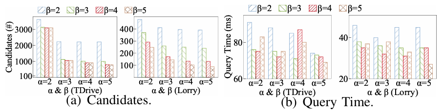 𝛼和𝛽的影响:文章中将𝛼∗𝛽的设置从2∗2开始并不断增加至5∗5,以观察𝛼∗𝛽的变化对TShape索引性能的影响。如图12(a)中展示在保持𝛼不变的情况下, 随着𝛽的增加,被访问的候选轨迹数量会不断减少。造成这种现象的原因是,较大的 𝛼∗𝛽 可以更精细地表示轨迹的形状,从而可以缩小检索范围。然而,较大的𝛼∗𝛽会产生更多的索引空间,导致数据存储更加分散。因此,查询处理需要更多时间来计算与查询范围相交的索引空间,并且I/O次数也会随之增加。所以,如图12(a)和(b)所示,虽然𝛼∗𝛽=3∗3时对轨迹形状的表示能力比3∗4稍差,但3∗3的查询更快。
