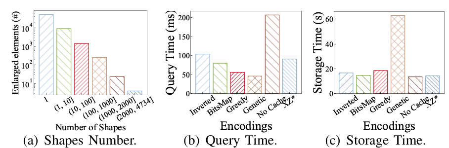 编码和索引缓存的影响:由𝛼∗𝛽个单元格形成的放大元素有可能产生2𝛼∗𝛽 种形状。然而,在现实世界的数据集中,这些形状中仅有一小部分会被用来表示轨迹。 如图13(a) 所示,对于TDrive数据集,任意用于表示轨迹的放大元素中使用的形状数量都不超过4734个。而且,大多数放大元素中使用的形状少于10个。因此,TMan采用了索引缓存机制来维护每个放大元素中实际使用的形状码。此外,原文还探索了不同的编码方法,以优化形状码的顺序。图13(b)展示不同形状码编码策略的影响。在不使用索引缓存的情况下,需要从2𝛼∗𝛽种形状中搜索可能与查询条件相交的形状上,会产生大量的计算时间。在各种编码方法中,遗传编码的性能略优于其他方法。因为,它更能为相似的形状分配相邻的索引值,从而减少查询过程中的磁盘I/O操 作。此外,文章还将索引缓存策略应用于XZ*索引中,TShape索引的性能仍然优于XZ* 索引。尽管如此,如图13(c)所示,与贪心编码和bitMap(位图)编码相比,遗传编码需要更多时间来确定形状码的最佳顺序,从而导致它的存储时间远高于其它编码。此外,不直接使用形状码来索引轨迹,原文中本实验也实现了利用所有相交单元格的反转列表 (Inverted)来存储轨迹数据。这种方案需要更多的存储成本,并会带来更多的I/O成本。 在查询时,此方案还需要大量数据删除重复数据。因此,它也比TShape索引慢。