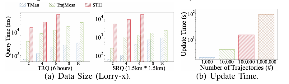 文章中本实验通过将不同数量级的新增轨迹批量插入到现有表格中,以评估更新的性能。从图14(b)中可以得出,随着数据量的增加,存储所需要的时间越多,但仍在可接受范围内。因此,TMan的更新策略能确保系统的灵活性。