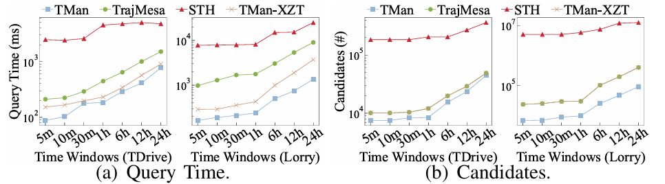 评估指标:文章在数据集TDrive与Lorry的时空范围内各随机生成了100个查询窗口,并以查询结果的中位数作为评价指标。