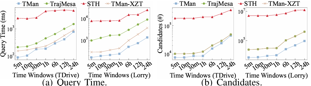 论文中评估了时间范围查询。图 15(a)显示了查询时间,图 15(b)显示了将被查询的数据集数量。对于 TrajMesa 和 TMan,候选项是访问轨迹,而对于 STH,候选项是访问点,因为轨迹被拆分为点并存储在 HDFS 中。图 15(a) 表明 TMan 实现了最佳性能。TrajMesa 使用 XZT 来索引轨迹的时间范围,而 TMan-XZT 在我们的框架中使用相同的 XZT 索引。TMan-XZT 优于 TrajMesa,因为它能够向下推送查询条件。TR index 具有精巧的索引结构和编码方法,与 TrajMesa 相比,TDrive 和 Lorry 的访问量分别减少了 30% 和 77%。此外,图15(b)显示,使用 TR 索引的 TMan 访问的数字轨迹最少,甚至比 STH 高出一两个数量级