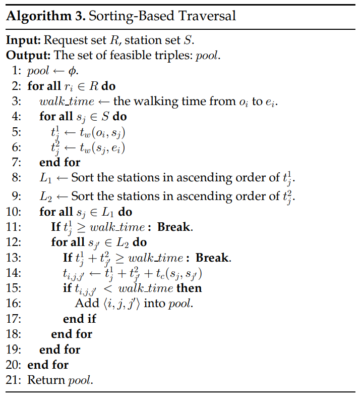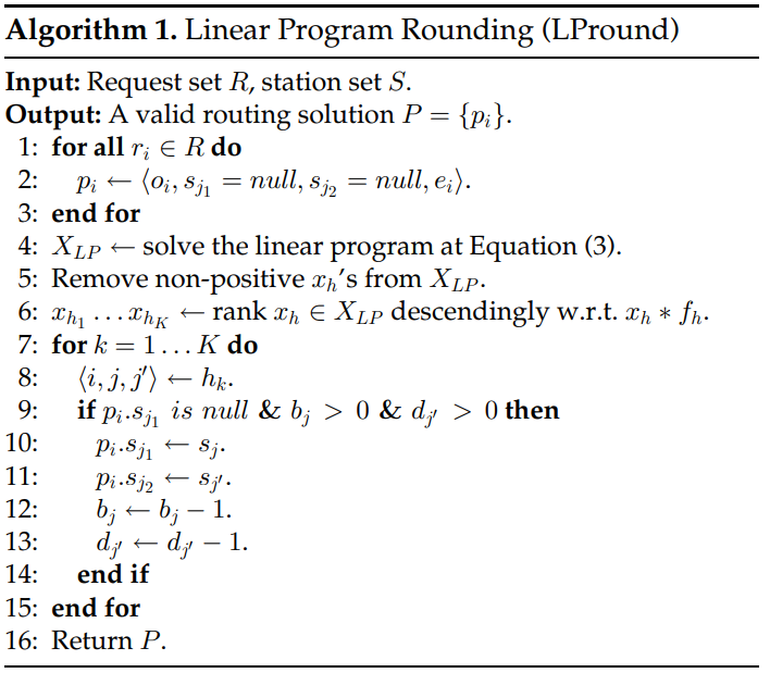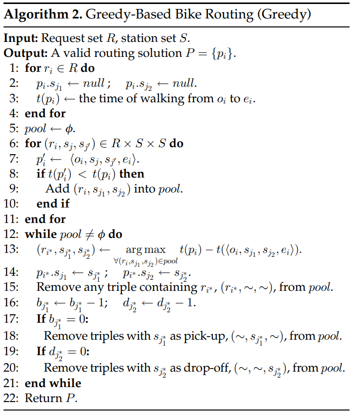 随着移动互联网的快速发展,共享单车系统在近年来得到了广泛的应用和普及。基于固定站点的共享单车系统已经引起了学术界和工业界的广泛关注,研究重点主要集中在单车租赁需求预测、单车调度等方面。相比之下,关于共享单车骑行者路由算法的研究相对较少。一个路由方案通常涉及两个站点,指示骑行者在哪个地点租借和归还单车。现有的路由研究大多针对单个骑行者,但在高峰时段,多个骑行者同时发出路由请求,这一问题尚未得到充分的探讨。本次为大家带来数据库领域顶级期刊TKDE 2023的文章《Centralized Routing for Bike-Sharing Systems》。共享单车作为共享经济的典型产物,近年来迅速普及并受到广泛关注,特别是在解决“最后一公里”出行问题方面,成为通勤者的便利选择。目前,共享单车系统主要有两种类型:基于站点的系统和无桩系统。基于站点的系统通过在多个位置设置自行车架(桩),并在电子控制下进行管理,骑行者可以在一个站点租借自行车,并在另一个站点归还。无桩系统则不依赖固定站点,骑行者可通过移动应用解锁并在任何合适位置停车。本文主要聚焦于基于站点的共享单车系统。在基于站点的系统中,骑行者面临的核心问题是如何选择取车和还车的站点,以尽量减少步行距离。为此,现有研究通常通过历史数据预测站点的自行车和车位的可用性。然而,这些研究多忽视了高峰时段多个骑行者同时发起路由请求的情况。虽然可以逐个解决骑行者的路由问题,但这种单个骑行者的短期视角难以提供全局最优解。前期处理的骑行者可能会占用某些自行车或车位,导致后续骑行者无法获取所需资源。因此,仅依靠个别最优解并不能确保全局最优,尤其是在资源有限的情况下。目前,关于共享单车集中路由问题的研究仍较为缺乏。该问题的挑战在于站点上自行车和车位的有限数量,多个骑行者可能争夺同一站点的资源,导致无法同时满足所有骑行者的需求。因此,需要在解决资源冲突的同时,优化骑行者的整体出行时间。因此本文研究了共享单车骑行者的集中路由问题,并证明了该问题是NP-hard的。本文将其表述为整数线性规划模型,并提出了一种舍入算法和基于贪心策略的路由算法为共享单车系统的优化提供新的解决方案。在现有研究中,整数线性规划(ILP)方法已被用于解决kDM问题(k-dimensional matching),因此本文首先证明共享单车骑行者路由问题可以等价地表述为一个整数线性规划问题,通过对其线性规划(LP)松弛解进行舍入,设计了一种ILP的近似求解方法,即LPround: • 排名构建(第1至第7行):这一部分算法首先为每个骑行者初始化一个默认的步行路径,然后通过线性规划求解每个骑行者的取车和还车站点建议。接着,去掉不可能的路径(如没有车或车位的站点),最后按路径的优先级进行排序,保留最有可能满足需求的路径。• 按排名进行舍入(第7至第15行):这一步,算法按照之前排序的优先级,逐一决定哪些路径可以被选为最终的取车或还车站点。对于每条路径,算法检查是否有足够的资源(如自行车或车位)来满足骑行者的需求。如果有,就将这条路径选入最终方案,并更新站点的资源状态;如果没有,就跳过这条路径,继续考虑其他可能的路径。时间成本分析:LP舍入方法的时间复杂度并未明确给出,因为本文使用了单纯形算法来求解该问题,而单纯形算法的时间复杂度仍然未知。然而,可以明确的是,pool(存放<i, j1, j2>三元组的池)的大小与程序中的变量数量相关,而变量数量又与解空间的大小正相关。变量数量众多导致了一个相当大的搜索空间,因此LP方法的时间成本也较大。 贪心启发式方法已广泛应用于求解组合优化问题,并取得了较好的表现。因此本文提出了一种基于贪心策略的路由算法,该算法通过贪心选择为骑行者分配最优路由计划。如算法2所示,贪心算法分为两个步骤:• 初始化(第1至第11行):在第1至第4行,算法为每个请求初始化路由计划,默认将骑行者从起点直接步行到终点。在第6至第11行,对于每个由请求和两个站点组成的可能三元组,计算相应的出行时间,并将其作为候选路由计划加入pool,前提是其出行时间小于步行的时间。• 贪心式站点分配(第12至第20行):当pool不为空时,贪心算法不断从pool中选择节省骑行时间最多的三元组(即相对于步行来说节省的时间最大)。每次选择一个三元组后,贪心算法通过将sj1和sj2分别分配给pi*.sj1和pi*.sj2来更新ri的路由计划。由于ri已经被分配了站点,贪心算法会将包含ri的所有三元组从pool中移除。接着,算法将sj1和sj2的自行车和车位数量各自减少1。如果减去后的bj1为0,表示sj1站点的自行车已经被借完,贪心算法会移除所有包含sj1作为取车站点的三元组。同样,dj2在第19行也会按照类似的方式进行检查。时间复杂度分析:初始化阶段的时间复杂度为 O(mn2),其中m为请求数量,n为车站数量,主要由第6至第11行遍历三元组的操作决定。每次while循环的执行时间复杂度为 O(mn2)。由于最多有m个请求需要路由,因此while循环的时间复杂度为 O(m2n2)。总体贪心算法的时间复杂度为O(m2n2)。本文提出了一种基于排序的遍历方法,通过剪枝三元组来加速pool的计算。一种简单的实现方法是遍历所有可能的三元组 R×S×S,这会导致总共测试mn2个三元组。本文通过剪枝不可能的三元组来优化计算成本,即排除那些总出行时间大于步行