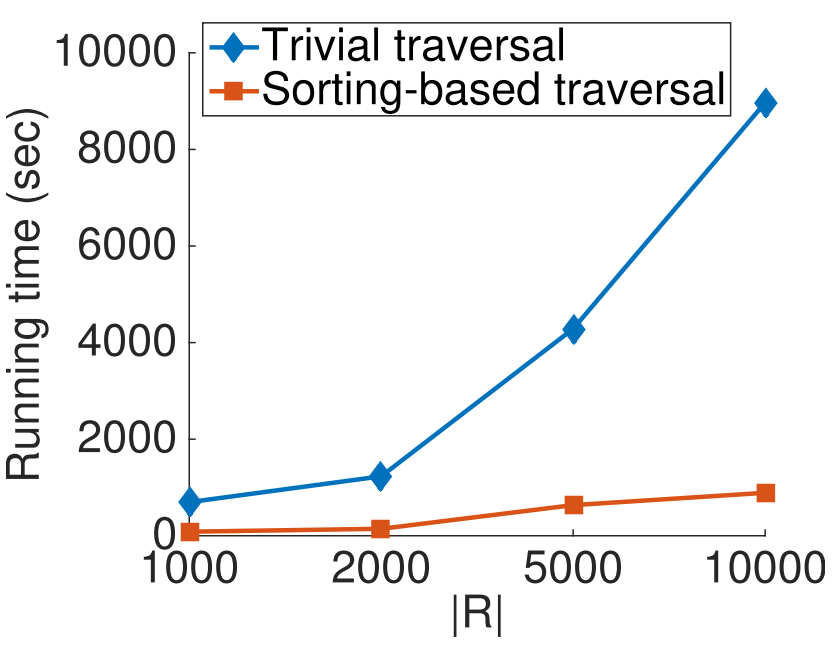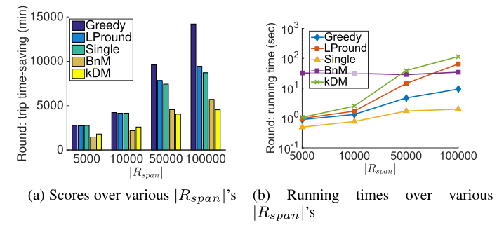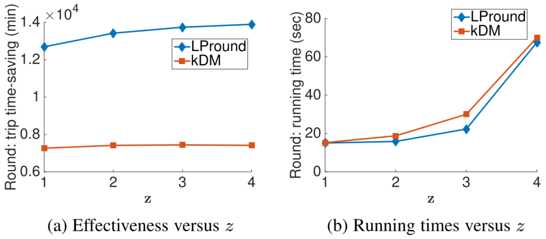 中的元素,直到找到某个车站满足以下条件:数据集. 论文使用了三个真实数据集GeoLife、T-drive、AIS以及一个合成数据集Brinkhoff。实验使用了Citi Bike在纽约曼哈顿部署的自行车站点数据,共有411个站点。对于步行速度和骑行速度,分别用vw和vb表示,默认值设定为5 km/h和20 km/h。对比方法. 本文将提出的贪心算法(Greedy)和LP舍入方法(LPround)与三个基准方法进行比较:Single[1]、kDM[2]和BnM[3]。Computing pool:本文首先调查了使用简单遍历方法和基于排序的遍历方法(算法3)计算池所需的时间,结果如图1所示。结果明显,基于排序的遍历方法比简单遍历更高效,得益于其剪枝策略。此外,简单遍历的运行时间随着请求数量的增加呈指数增长。相比之下,基于排序的遍历方法的运行时间增长保持平稳。即使请求数量达到1万,其计算时间也仅为数百秒,仍然非常高效。LP-Based Methods:对于两种线性规划舍入方法——LPround和kDM,本文通过调整z来控制程序中的变量数量,如图2所示。 如图2a所示,LPround的得分明显高于kDM。如前所述,将kDM应用于实验任务时,得到的线性程序中的变量数量是LPround的