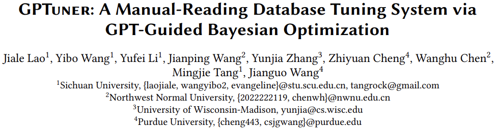 现代数据库管理系统(DBMS)有数百个可配置旋钮来控制系统行为。确定这些旋钮的值以提高DBMS性能是数据库社区中长期存在的问题。目前现有基于机器学习的调优方法仍然会产生显著的调优成本,或者只产生次优性能。这是因为它们要么忽略了可用的广泛领域知识(例如 DBMS 手册和论坛讨论),并且仅依赖于基准评估的运行时反馈来指导优化,要么仅有限地利用领域知识。本次为大家带来数据库领域顶级期刊PVLDB 2024的文章《GPTuner:A Manual-Reading Database Tuning System via GPT-Guided Bayesian Optimization》。GPTuner是一个 GPT 引导的贝叶斯优化进行手册阅读的数据库调优系统,它广泛且自动地利用领域知识来优化搜索空间并增强基于运行时反馈的优化过程。