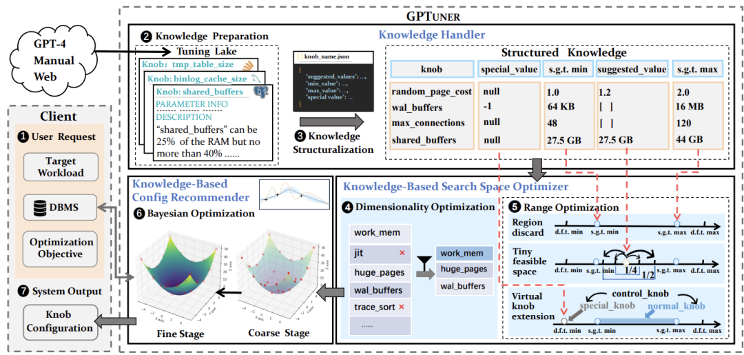 DB调优问题:对于一个数据库系统,数据库优化器需要在给定搜索空间θ和性能指标 f(如吞吐量或延迟)后,在搜索空间中找到一组最优参数θ*(假设目标是一个最大化问题),满足:由于有数百个可调节的旋钮且旋钮数值可能为连续或分类变量,旋钮调优是具有挑战性的。目前的研究提出了三种方法:基于启发式、基于贝叶斯优化(BO)和基于强化学习(RL)。进行实验比较后,发现基于贝叶斯优化的方法SMAC(Sequential Model-based Algorithm Configuration)产生了最好的性能,因为它使用随机森林作为代理,利用其在高维和异构配置空间建模方面的效率。该论文将SMAC视为当前最先进的不以文本作为输入的优化器,并旨在进一步改进它。鉴于GPT-4所展示的令人印象深刻的上下文学习能力,GPT-4为整个论文中的默认语言模型。(1) 用户提供要调整的DBMS(例如PostgreSQL或MySQL)、目标工作负载和优化目标(例如延迟或吞吐量)。(2) GPTuner从不同来源(如GPT-4、DBMS手册和网络论坛)收集和提炼异构知识,以构建Tuning Lake,这是一个DBMS调优知识的集合。(3) GPTuner将Tuning Lake中精炼的调优知识统一到机器可访问的结构化视图中(例如JSON)。(4) GPTuner通过选择要调整的重要旋钮来降低搜索空间的维度(即,要调整的旋钮越少,意味着维度越少)。(5) GPTuner根据结构化知识,根据每个旋钮的值范围优化搜索空间。(6) GPTuner通过一种新的粗到细贝叶斯优化框架探索优化的空间。(7) 在资源限制内(例如用户指定的最大优化时间或迭代次数)识别令人满意的旋钮配置。