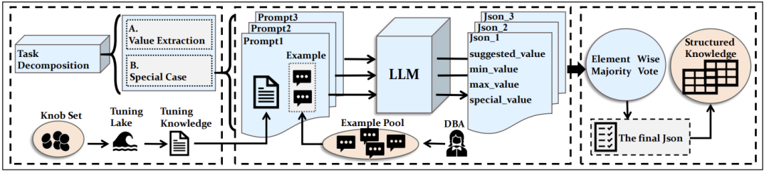 Recommender)。该组件负责将来自不同来源的异构知识转换为机器可读的格式,以便后续优化过程使用。知识处理器的流程可以分为知识准备和知识转化两个步骤。知识准备又可以细化为数据摄取、数据清洗、数据集成和数据校正四个步骤。数据摄取包括LLM,DBMS手册和网络论坛的知识。数据清洗指过滤掉与系统视图冲突或质量低下的知识。LLM 会比较调优知识和官方系统视图(例如 PostgreSQL 的 pg_settings),并排除任何不一致的内容。数据集成是指将来自不同来源的知识进行汇总,处理可能存在的冲突。根据不同信息源的可靠性手动设置优先级,例如官方手册优先级最高,而 LLM 优先级最低。数据校正确保汇总后的知识与源内容保持事实一致性。LLM 会检查汇总结果是否存在与源内容不符的情况,并进行修正直到完全一致。知识转化包括属性确定和属性值确定两部分。属性确定是定义结构化知识中包含的属性,包括建议值、最大值、最小值和特殊值。属性值确定是从文本中提取特定属性值。由于 LLM 的易碎性,作者开发了提示集成算法来提高提取结果的可靠性。包括任务分解(将提取任务分解为多个子任务,例如提取建议值、最小值、最大值和特殊值),提示准备(为每个子任务准备多个提示,并包括示例来利用 LLM 的上下文学习能力),结果聚合(通过多数投票策略聚合来自不同提示的结果,选择出现频率最高的值作为最终结果)。
