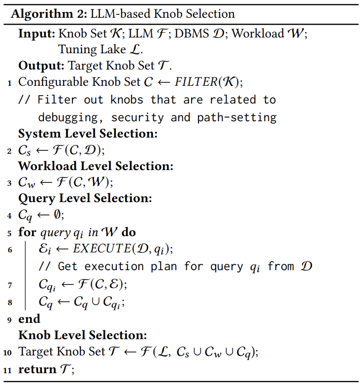 优化器从两个方面对搜索空间进行优化。首先,从维数上减小了搜索空间的大小,其次,关注每个旋钮的取值范围来优化搜索空间。作者提出区域丢弃(Region Discard、微小可行空间(Tiny viable Space)和虚拟旋钮扩展(Virtual Knob Extension)三种方法,分别用于丢弃无意义的区域、突出有希望的空间和处理特殊情况。对于维度优化,作者开发了基于LLM的旋钮选择算法(见图3)。它希望利用LLMF从旋钮集K中为特定工作负载w下的DBMS选择重要的旋钮T。该算法首先准备一个可配置的旋钮集C,其中不包括与调试、安全和路径设置相关的旋钮(第1行)。接下来,它从四个不同的级别选择旋钮:系统级别、工作负载级别、查询级别和旋钮级别。在系统级别选择中,识别极大地影响DBMS性能的旋钮,产生集C𝑠(第2行)。在工作负载级别选择期间,向LLM提供工作负载类型(例如,OLTP或OLAP)和优化目标(例如,吞吐量或延迟)来准备旋钮集C𝑤(第3行)。查询级别选择深入研究工作负载中的每个查询𝑞º(第4-9行)。具体而言,检索每个查询的执行平面,并通过诊断每个查询的性能瓶颈,识别与瓶颈相关的旋角,提取有影响的旋角集C𝑞。利用LLM F将相互依赖的旋钮补充到C𝑠,C𝑤和C𝑞的联合中,从而产生最终的目标旋钮集T(第10行)。