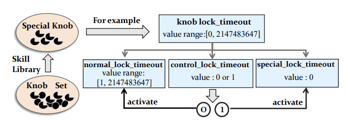 其中,𝑉是参数的建议值,𝑈是参数的最大值,𝛽缩放系数,取值范围为 [0, 1],由用户定义。在实验中,𝛽∈{0,0.25,0.5},作者对所有数值旋钮进行这种偏差处理,得到的离散空间就是微小可行空间。虚拟扩展旋钮指每个具有特殊值的配置参数都会被扩展为三个虚拟参数,分别为control_knob(值为 0 或 1,用于控制是否使用特殊值),normal_knob(表示原始参数的正常值范围)和special_knob(表示原始参数的特殊值)。通过这种方式,优化算法可以探索特殊值的所有可能值,包括特殊值 0(以lock_timeout为例,见图4)。