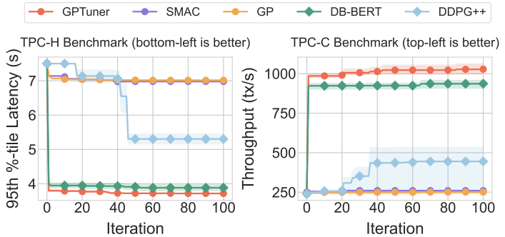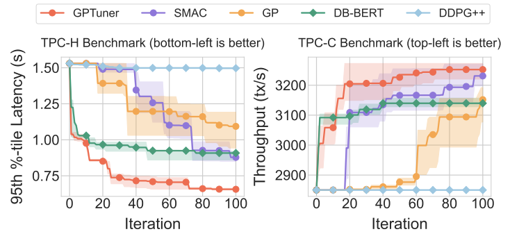 数据库管理系统:PostgreSQL 和 MySQL工作负载:TPC-H(OLAP)和TPC-C(OLTP)硬件环境:云服务器,配置 24 核 CPU、110GB 内存和 931GB SSD基线方法:DDPG++、GP、SMAC 和 DB-BERT实验结论:在 PostgreSQL 和 MySQL 上,GPTuner 都比基线方法更快地收敛到最佳配置,并且性能提升幅度更大。与 DDPG++、GP 和 SMAC 等不使用领域知识的方法相比,GPTuner 的收敛速度提高了 12.6 倍以上,性能提升幅度达到了 30%。与 DB-BERT 相比,GPTuner 的收敛速度更快,性能提升幅度也更大。