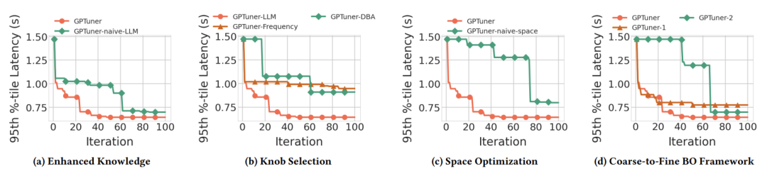 进行消融实验,分析 GPTuner 各个模块的贡献。消融实验结果表明,GPTuner 的各个模块都对性能提升做出了贡献。