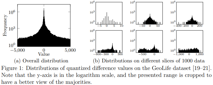 Floating-Point Compressor Designed for Time Series Databases》,它提出了Machete,它首先使用了一个有效的霍夫曼编码和优化的可变长度量化(VLQ)的混合编码器,其次利用自适应编码选择使其优于短片数据压缩比,最后整体简单的框架确保了快速解压缩。多年来每天需要收集数TB的时间序列数据并存储已经是普遍的情形。为了有效处理数据,时间序列数据库设计了方便的分析功能和高效的数据布局。随着TSDB的普及以及数据规模的不断扩大,TSDB压缩器受到越来越多的关注。通过对当前TSDB的研究,论文总结了TSDB压缩中三个显著的要点:(1)严格的误差界限使得损失压缩器在大多数情况下都是可行的。这是因为时间序列数据主要用于趋势分析和预测,而损失压缩器造成的小误差对趋势影响不大。此外,固定小数点数据的小误差可以通过四舍五入来修复。如果压缩误差小于±0.5×10−l,则带有l位小数的数据的损失压缩值可以通过四舍五入无损地恢复。因此,有损压缩器可用于普通情况,无误差允许且值具有不确定小数位数的极端情况则使用无损压缩器。(2)数据以短片段进行压缩。TSDB分别对数据进行短片段压缩,有助于减少读取放大(在解压缩中)和并行处理数据。(3)解压速度至关重要。这是因为解压速度直接影响查询吞吐量和延迟。压缩速度不那么重要,因为数据压缩与写响应异步进行,对写延迟和吞吐量影响不大。提出了一种新型的损失压缩器 Machete,它将损失压缩器的高压缩比与TSDB压缩器的短片段友好和高解压速度结合起来。Machete遵循LFZip和SZ3使用的预测-校正框架。但与LFZip和SZ3专注于高精度预测器不同,它使用简单的预测器,并通过高效的编码器实现上述显著要点。LFZip和SZ3都采用了预测-校正框架。该框架在压缩中有两个阶段:预测和编码。在预测阶段,一个预测器为每个数据生成一个预测值,然后输出预测值与实际值之间的量化差异。在编码阶段,一个熵编码器对量化差异进行编码。预测阶段将浮点数转换为围绕零点聚集的整数,使它们更容易编码。在解压缩中,量化差异被解码后,使用相同的预测进行校正。采用这样的框架的压缩器在时间序列数据库(TSDB)中遇到几个困难。一方面,复杂的预测器通常会影响压缩/解压速度,这对于TSDB来说是不可接受的。另一方面,纯熵编码器不适合短片段压缩。熵编码器面临的困难如下:(1)冗余减少。图1b中的频率远低于图1a中的频率,这是数据分片的必然结果。冗余减少可能不会影响数据的熵,但它增加了熵记录的时间和空间成本(例如,Huffman编码的Huffman树或算术编码的概率表)。同时,利用跨片段的冗余是不允许的,因为它会引入序列处理和读放大,这与TSDB执行的数据分片的意图相矛盾。(2)分布变化。如图1b所示,分布可能在不同的片段之间差异很大。这种差异影响了数据的熵,在一些极端情况下(例如图1b中的最后一个图),频率甚至被平均化。