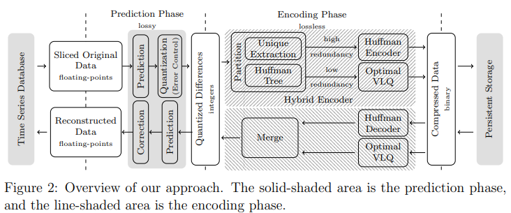 图2说明了设计概述。一个时间序列数据库将一系列浮点数作为Machete压缩器的输入。作为第一步,Machete对每个值进行预测,计算预测值与实际值之间的差异,并将差异量化为整数。在量化过程中会丢失一些信息,但保证损失在用户指定的范围内。在获取所有量化差异后,Machete使用无损编码器对它们进行压缩。在解压缩过程中,解压缩器解码量化差异,进行相同的预测,然后用量化差异校正预测以重构浮点数据。