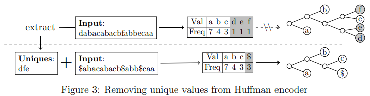 将浮点转换为量化差值后,使用混合编码器对其进行压缩。它结合了霍夫曼编码和可变长度量化(VLQ)来处理各种数据分布。霍夫曼编码为高频值分配更少的位,而VLQ为接近零的值分配更少的字节。从图1可知,量化的差异一般很可能接近于零,这就是为什么选择VLQ来压缩霍夫曼编码不擅长的低冗余数据。选择了底层编码器后,剩下的问题是正确地将输入进行分区并将其分配给编码器。实际上,Huffman 编码已经完成了部分工作。如果使用 Huffman 编码器对所有数据进行编码,那么低冗余数据就位于 Huffman 树内:所有呈现的值都恰好在树叶中记录了一次。所以,并不直接使用 VLQ对 Huffman 树中记录的值进行压缩,而是添加了一个额外的步骤来从 Huffman 编码器中提取唯一值(仅出现一次的值)。图3说明了如何提取唯一值。在统计了每个值的频率作为 Huffman 编码所需的编码之后,学习到了唯一符号,并将它们记录在另一个数组中,并用相同的特殊值(图3中的'$')替换它们。在提取了唯一值并完成了 Huffman 编码部分后,使用 VLQ 将 Huffman 树的值与唯一值一起压缩。在解码时,每次遇到特殊值时,从唯一值数组中加载一个唯一值。