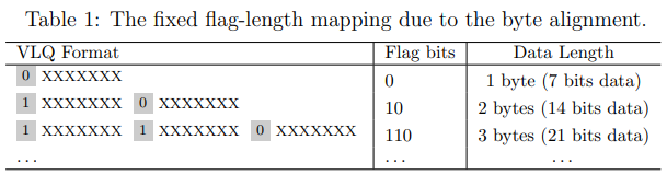 可变长度数量化(VLQ,也称为可变长度整数)是一种编码方法,它使用可变长度的字节来编码整数。它去除整数的头部零(或者如果是负数则为头部的1)(但至少保留一个头部零/一位作为符号位),这样当整数接近零时可以节省空间。VLQ 使用每个字节的最高位作为一个标志位,指示是否有更多的字节需要读取,并将数据存储在其余的位中。如果将每个字节中分散的标志位放在一起,会发现 VLQ 实际上使用了一个前缀码来记录字节数,如表1所示。