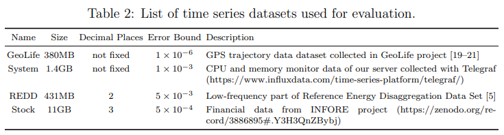 Gold 6154 CPU、112.5 GiB DRAM 和7200 转/分钟磁盘的 Ubuntu 18.04 服务器上运行。在第一部分中,将 Machete 与其他压缩器进行比较;在第二部分中,将 Machete 和其他一些压缩器应用于 InfluxDB,这是一种流行的开源时间序列数据库(TSDB),以探究其影响。所有数据均以64位浮点数表示,REDD 和 Stock 具有固定的小数位数。表2还列出了在评估中使用的所有有损压缩器的默认误差界限。对于 GeoLife 和 System,误差界限足够小,适用于大多数应用。对于 REDD 和 Stock,误差界限足够小,可以通过将重建的数据舍入到相应的小数位数来检索原始数据。并非将整个数据集一次性压缩,而是首先将数据切分为不超过1000个数据点的片段(这是InfluxDB中使用的片段长度),然后对这些片段进行分别压缩。