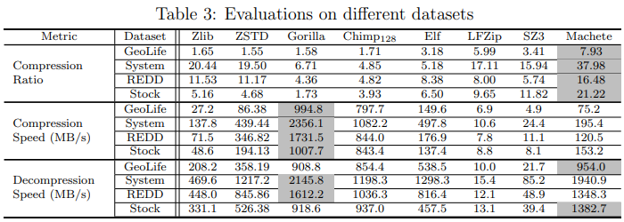 将 Machete 与其他压缩器进行比较,包括:(1)通用无损压缩器:Zlib2(也称为 GZip)和ZStandard(ZSTD),(2)TSDB 无损压缩器:Gorilla、Chimp128和 Elf,以及(3)有损压缩器:LFZip、SZ3。在这一部分,测量压缩比(原始数据大小与压缩大小的比率)、压缩速度和解压缩速度。相对而言,压缩比和解压缩速度更为重要。