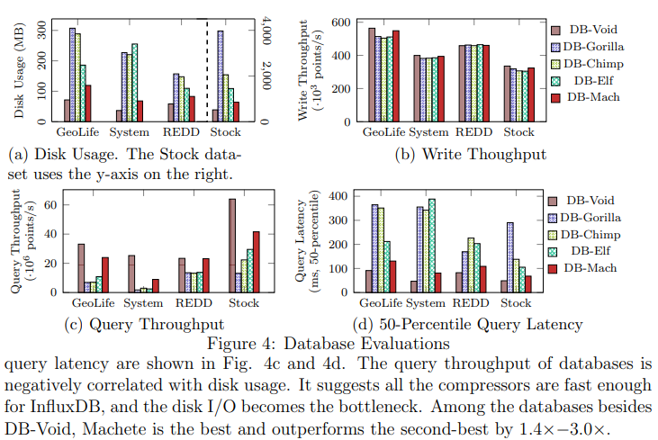 表3显示了突出显示了最佳记录的评估结果。Machete 在压缩比方面具有绝对优势,优于第二名32%−80%。同时,Machete 的解压缩速度也处于前列,接近于 Gorilla。就压缩速度而言,Machete 并无优势,但它对于时间序列数据库是足够的。在评估中,LFZip 和 SZ3 的表现远低于预期,这是短片段压缩的结果。对片段长度设置为216进行了另一次类似的评估,并发现 LFZip 和 SZ3 的压缩比接近于 Machete,而且运行速度快了几倍。同时,Machete 的性能仅略微提高。换句话说,与 LFZip 和 SZ3 相比,Machete 随着片段变短,性能下降较少。将 Chimp128、Elf 和 Machete 应用到InfluxDB 中,以查看使用不同压缩器对磁盘使用情况、写入吞吐量以及查询延迟/吞吐量的影响。分别将数据库命名为 DB-Chimp、DB-Elf 和DB-Mach。除此之外,还有一个名为 DB-Void 的数据库,它会丢弃所有浮点数据,并在查询时返回0,而 DB-Gorilla(Gorilla是 InfluxDB 的原始压缩器)。DB-Void 用于显示压缩器对数据库可以带来的改进的上限。实验结果如下图所示: