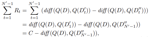 R = diff(Q(D),Q(D’)) - diff(Q(D), Q(D’’))其中diff(Q(D), Q(D’))衡量了在D和D‘上查询结果的差异,让奖励R在从