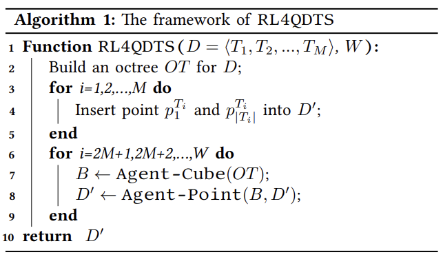 如算法1所示,首先为原始轨迹数据库D构建八叉树(第2行),然后将每条轨迹的第一个和最后一个点插入简化轨迹数据库D'(第3 - 5行),剩余的预算W-2M在第6~9行中利用。首先调用Agent-Cube选择一个立方体B,然后将立方体传递给Agent-Point更新D',这个过程一直持续到预算耗尽,最终返回包含W个点的D'(第10行)。