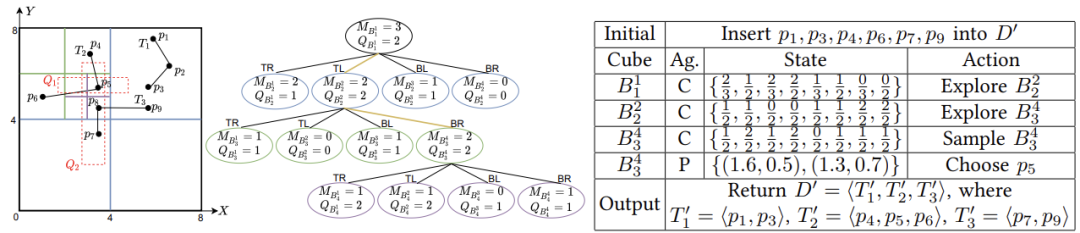 图1是RL4QDTS的一个运行示例,为了方便演示,忽略时间维度,使用四叉树。输入D = <T1,T2,T3>,存储预算W = 7,两个范围查询Q1,Q2。基于D,有Q1(D) = <T2>,Q2(D) = <T2,T3>,记录树节点中的轨迹数(MB)和查询数(QB)。(1)将每条轨迹的首尾点插入D‘,剩余预算1(即7-2*3)。(2)Agent-Cube从节点