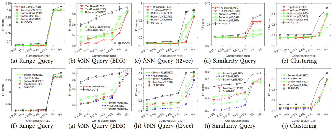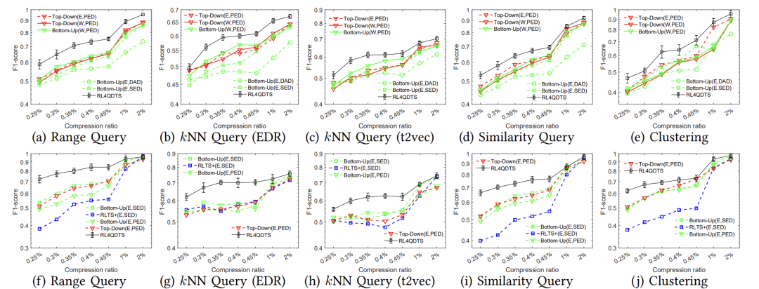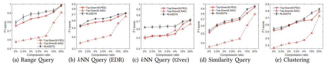 - 在四个真实轨迹数据集上进行了实验,结果表明,在两种适应性、四种误差度量以及不同存储预算下,针对五种查询操作,RL4QDTS始终优于现有的EDTS解决方案。例如,对于范围查询,其改进达到了35%,对于两种kNN查询分别为41%和28%,对于相似度查询为35%,对于聚类为40%,均优于最佳基线方法。