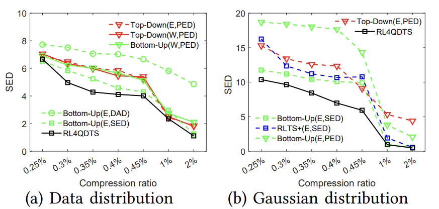 50,每50个点插入时执行100个查询,以评估模型性能。 实验对比了五种查询任务在三种查询分布下的算法有效性,确定了在数据、高斯和真实分布下各个查询任务的最佳表现算法。如图2、图3和图4所示,结果表明RL4QDTS算法提供更高质量的查询结果,在不同压缩率、查询任务、生成分布和真实数据集上均优于现有的基于误差驱动的方法。