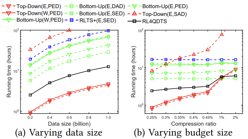 效率评估:论文进一步研究了预算大小W从0.25% * N到2% * N的影响,其中N固定为1亿个点。图6显示了在Geolife上的运行时间,RL4QDTS算法比Top-Down的适应性慢,但比Bottom-Up的适应性快至少两倍。随着W的增加,因为它通过Agent-Point基于立方体内的部分轨迹计算值,而Top-Down的适应性是基于整个轨迹计算值的,所以RL4QDTS变得比Top-Down的适应性更快。