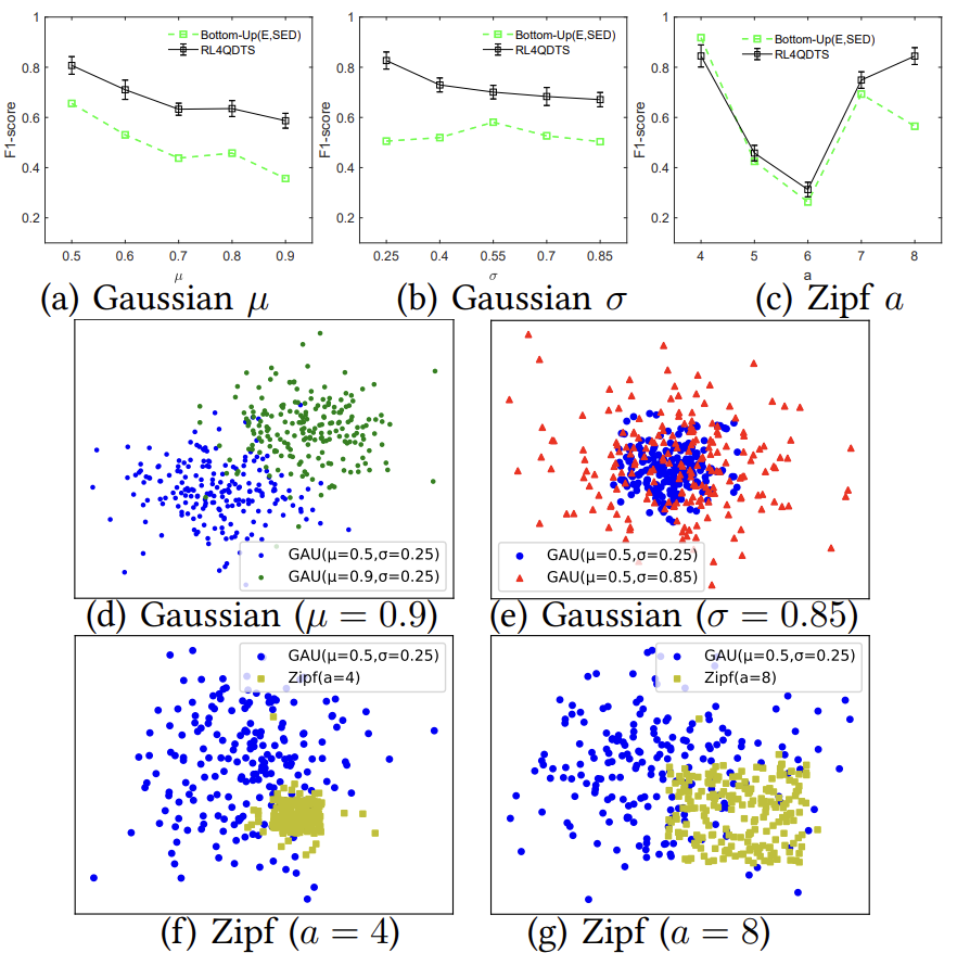 0.25)来训练RL4QDTS,并评估其在µ(0.5~0.9)和 σ(0.25~0.85)变化的范围查询中的有效性(见图7(a)和(b))。其次,使用相同的模型在高斯分布上训练后,论文测试了其对Zipf分布的范围查询的有效性,该分布具有不同的指数参数a(从4~8),以评估在显著的分布变化下的转移性能(见图7(c))。RL4QDTS在所有µ和σ设置下始终优于基线(见图7(a)和(b))。在图7(c)中,尽管查询分布发生了显著变化,但RL4QDTS的表现仍然相当不错甚至更好,这证明了它的稳健性,图7(d)-(g)中可视化了分布变化。