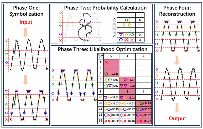 如图1所示,该算法框架共分为四个阶段:时间符号序列化、概率计算、似然优化、时间序列重建。时间序列符号化将每个连续的数值数据点转换为有限集合的符号,便于正确捕获循环模式并使后续概率计算成为可能。概率计算阶段指定了基于统计确定符号化时间序列概率的方法。似然优化采用基于动态规划的递归算法实现似然最大化,通过回调得到经过清洗的符号化时间序列。然后在时间序列重建阶段将其中的符号转换回数值,从而产生最终的清理结果。