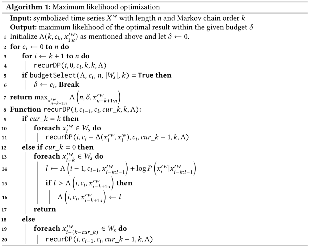 其中r为总共的可用符号数量,C为在符号化时间序列Xw下对应子序列的概率。文章采用基于动态规划的伪多项式时间算法解决该问题,其目的是寻找具有最大似然的符号化时间序列。具体的算法实现伪代码如下: