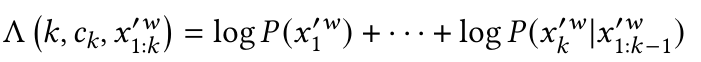 其中ci为清洗花费。如果xi'w不等于xiw,则ci-1 = ci – 1;否则ci-1= ci。初始化时,对任意符号化清洗数据点,如果ck大于前k项清洗损失和,则最大似然公式为: