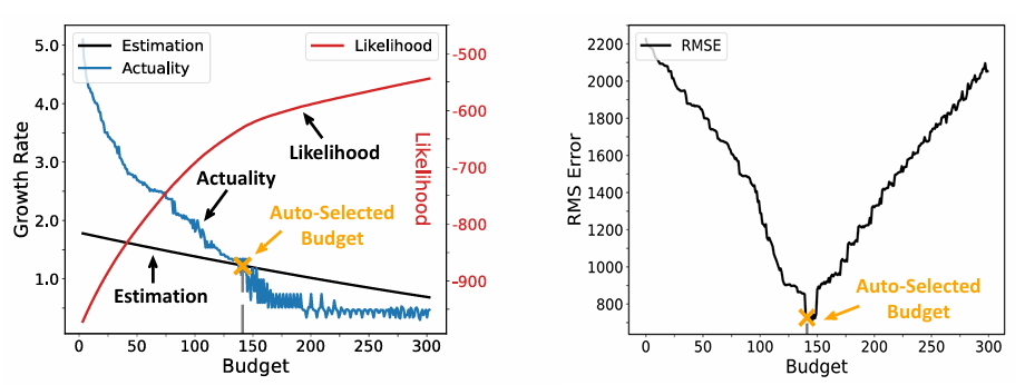 如图2所示,文章目标是降低困惑度,提高似然结果。随着预算的增加,似然值不断增加,RMS均方根误差不断降低,在预算140时,RMS误差最小,后续稳步上升,但似然依旧不断增长。这其中存在过度清洗的可能性。
